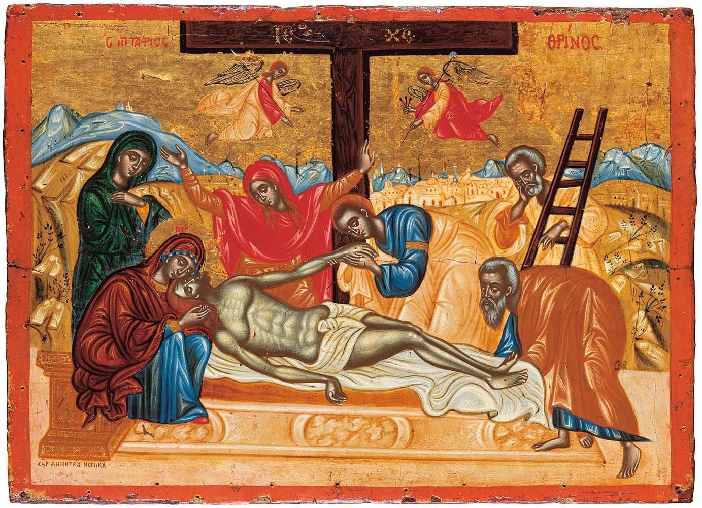 Στην εικόνα συναντούμε εικονογραφικό τύπο γνωστό σε παλαιότερες εικόνες βυζαντινής καταγωγής, όπως η εικόνα στο Σινά, των αρχών του 15ου αιώνα1. Στην εικόνα αυτή κοινή είναι η στάση και η θέση των κύριων μορφών της σύνθεσης. Η Παναγία κάθεται στο προσκέφαλο του Χριστού, ο Ιωάννης ασπάζεται το χέρι του σκυμμένος και ο Ιωσήφ, σε όμοια στάση, ανακρατεί τα πόδια του. Διαφέρει η θέση της Μαρίας Μαγδαληνής, που στην εικόνα του Σινά στέκει αριστερά στο πλάι, όρθια, στη θέση της γυναίκας, που στην εικόνα μας στέκει πίσω από την Παναγία. Ως προς τη θέση της Μαγδαληνής με υψωμένα χέρια στο κέντρο, πίσω από το Χριστό και μπροστά από το Σταυρό, συναντούμε το βυζαντινό της πρότυπο στις τοιχογραφίες της Τράπεζας της Πάτμου, γύρω στο 1200, καθώς και σε χειρόγραφο του 1322-1340 στην Οξφόρδη2. Η συγγένεια με αυτά τα βυζαντινά πρότυπα επεκτείνεται στην απεικόνιση της σκηνής μπροστά από το Σταυρό που υψώνεται μέσα σε τοπίο με βράχους και μπροστά στα τείχη της Ιερουσαλήμ. Σε μεταγενέστερες εικόνες συναντούμε ανάλογη διάταξη, με τη Μαγδαληνή στο κέντρο με υψωμένα χέρια, μπροστά από το Σταυρό, όπως σε εικόνα λαϊκής τεχνοτροπίας, του τέλους του 18ου αιώνα, στη Συλλογή Οικονομοπούλου3.